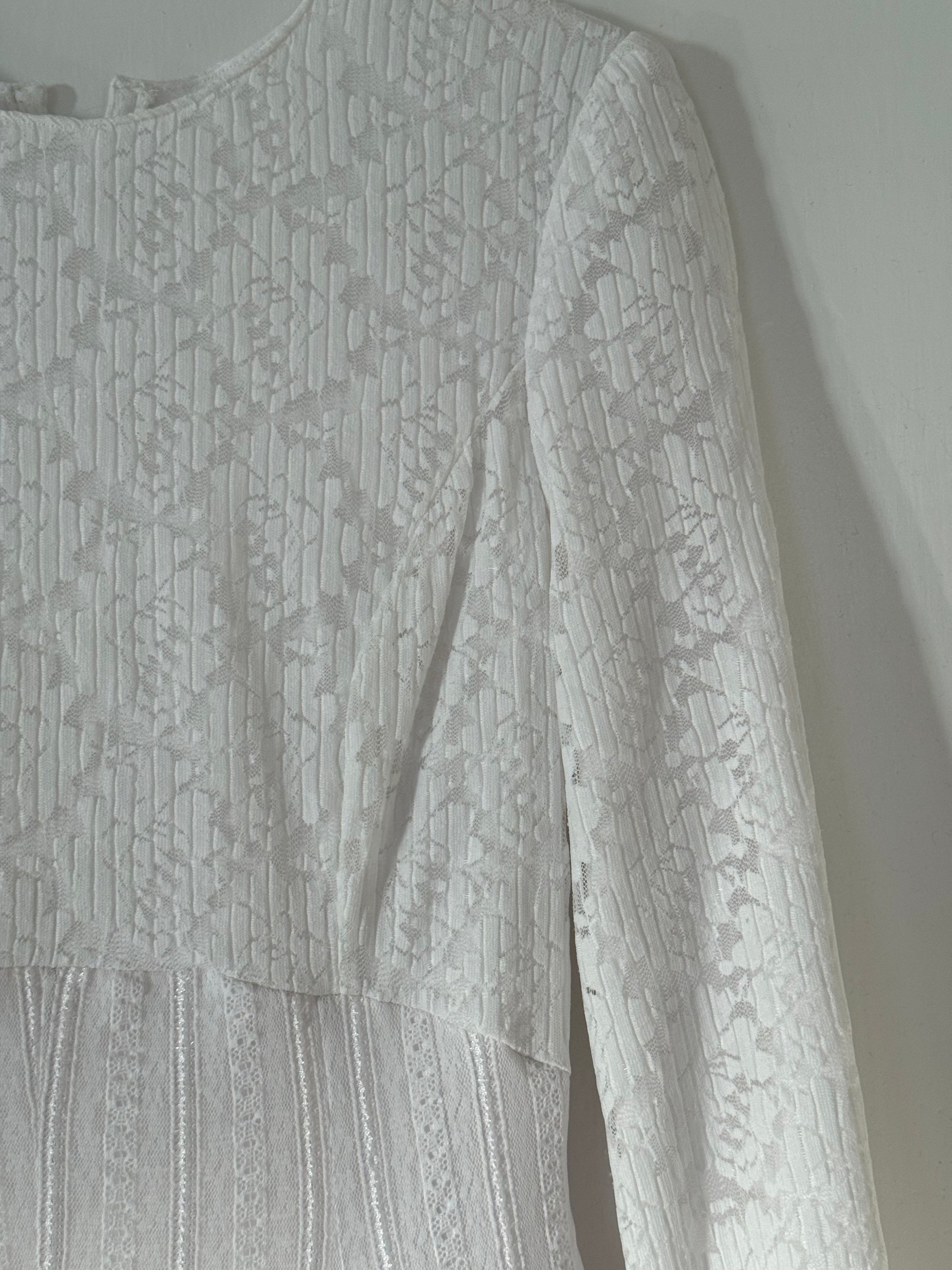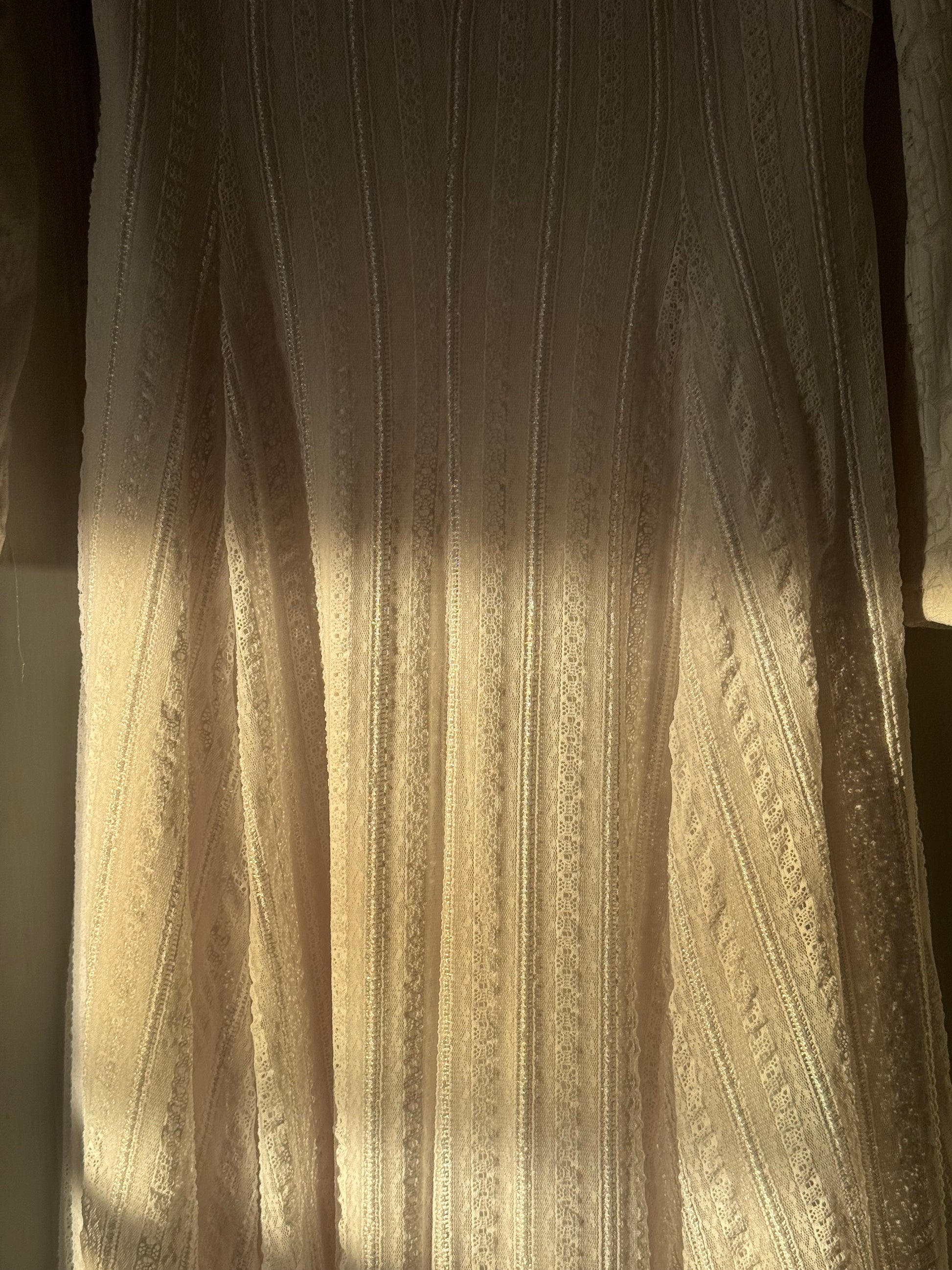 A romantic 1970s bridal maxi with the dreamiest blend of texture and movement. This gown is crafted in two distinct lace patterns with a sweeping skirt made from long vertical lace panels that elongate the silhouette and float effortlessly with each step. Stretchy comfortable fabric for all-day wear.
