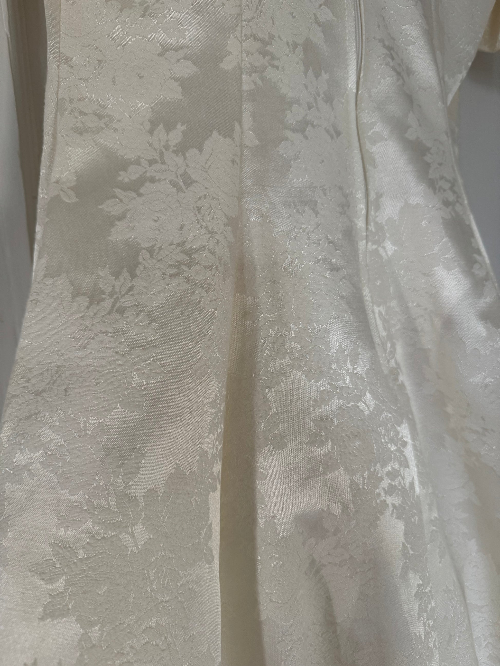 One-of-a-kind 1990s lace mini dress with puff sleeves and a scalloped sweetheart neckline. Made by Jump, a nostalgic label from the late 80s–90s, this piece blends playful romance with timeless bridal charm. The fitted bodice and flared skirt make it perfect for dancing the night away, while the textured floral lace keeps it effortlessly bridal-adjacent.