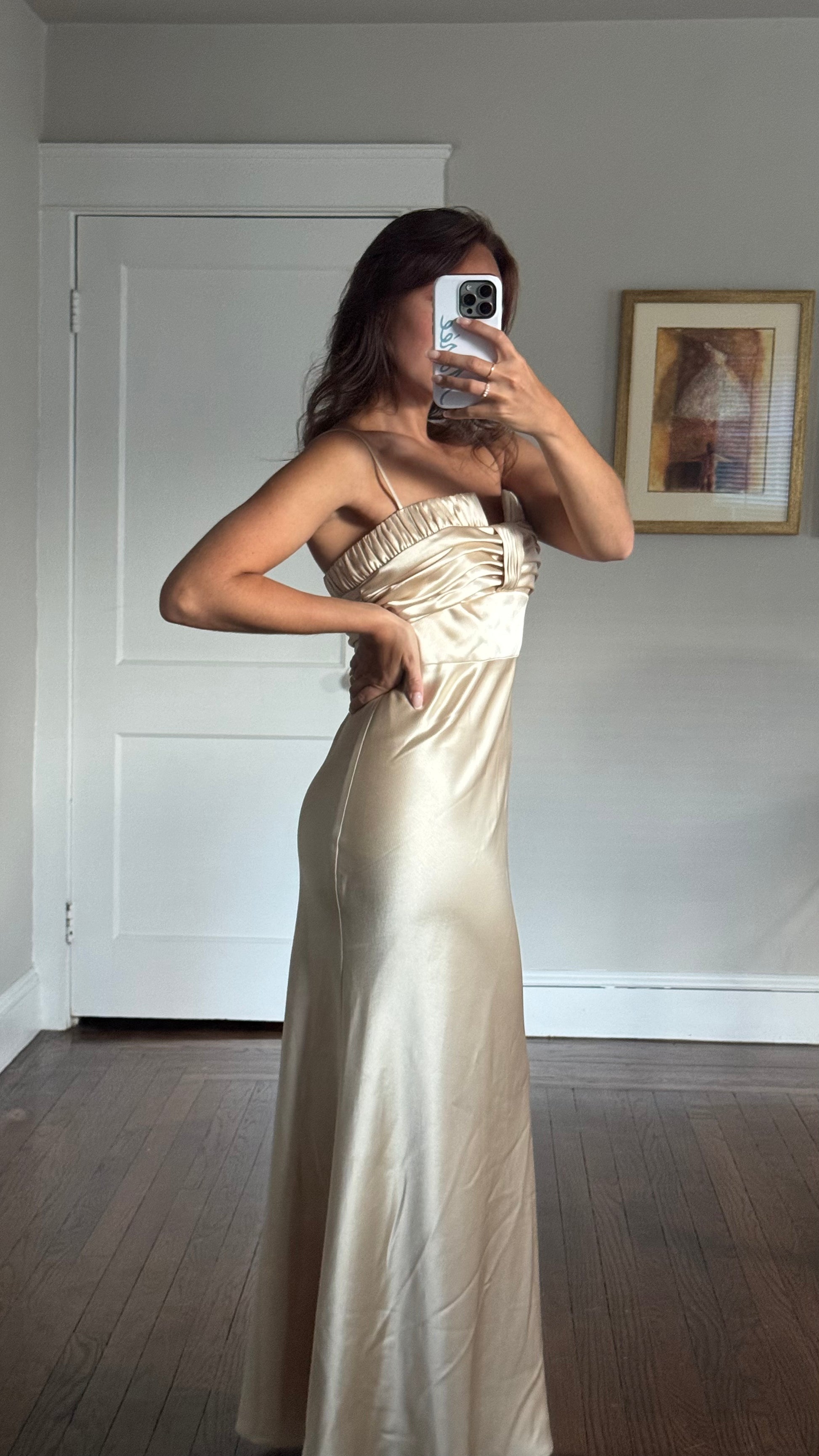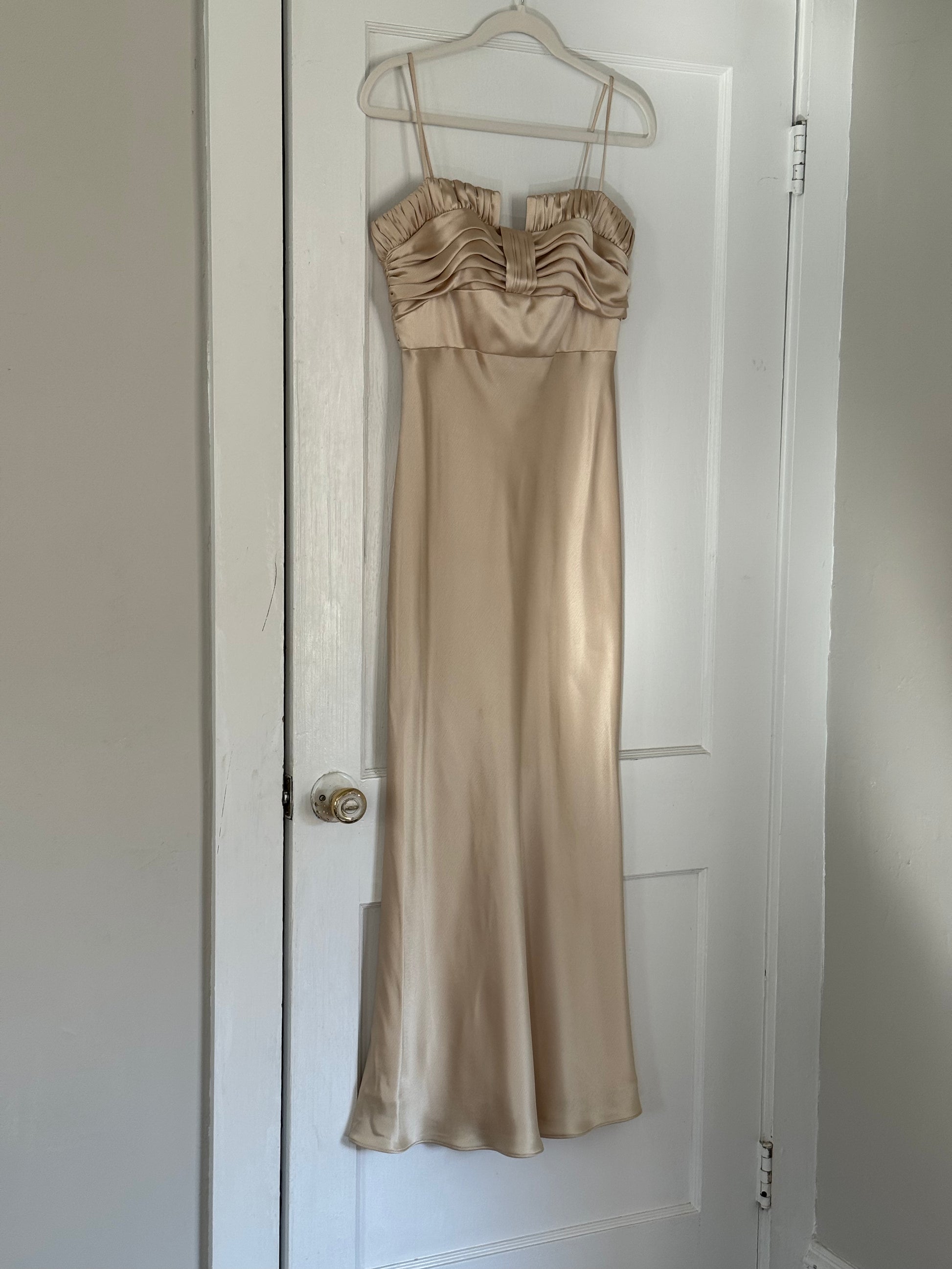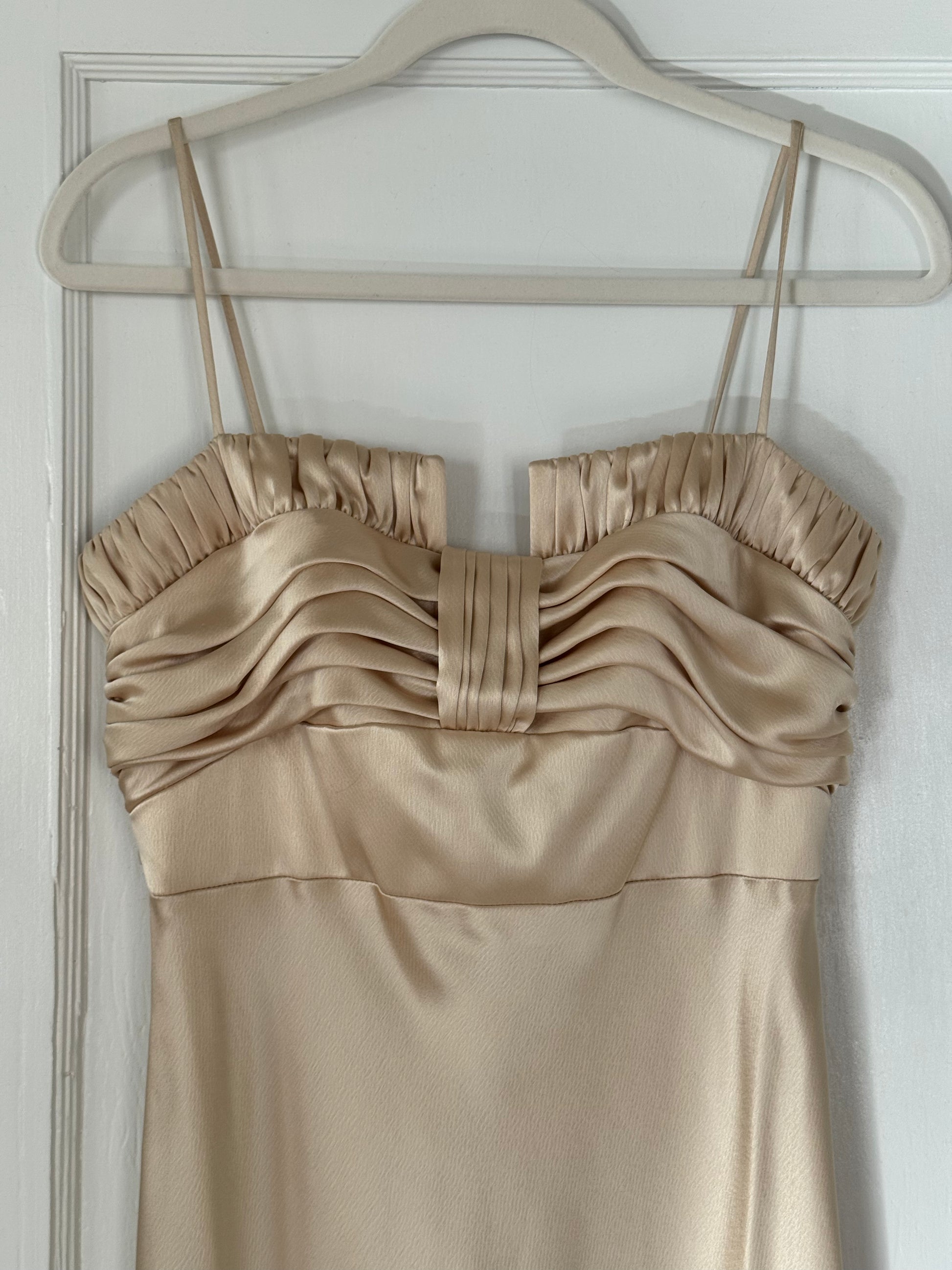 A vintage ABS by Allen Schwartz gown in a soft champagne tone. Designed in the 1990s, this piece combines sleek lines with understated detail — featuring a fitted bodice, gentle flare through the skirt, and a liquid satin finish that catches light beautifully.