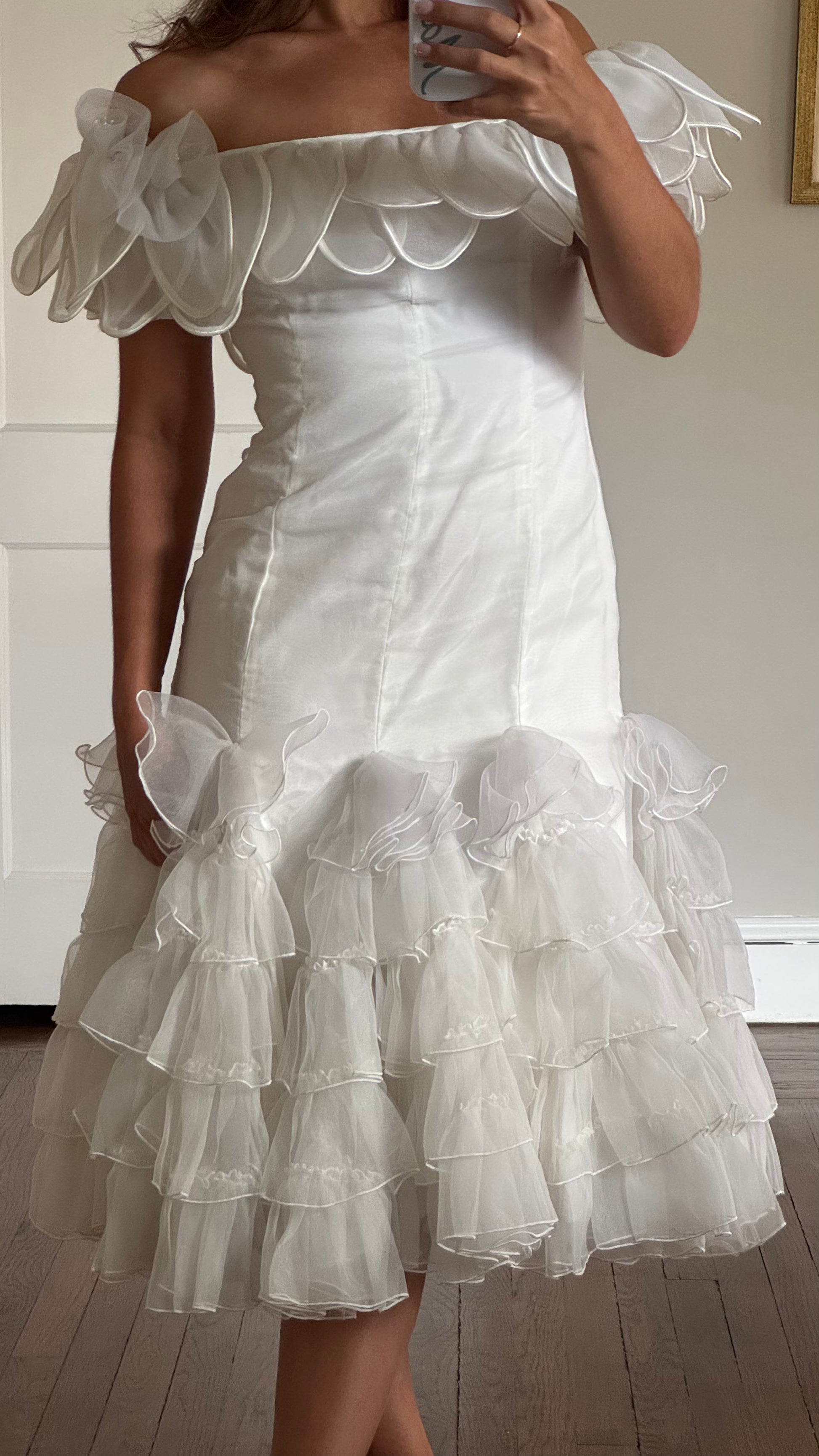 One of my favorites in this collection <3. This Raggi Florida wedding gown from the 1980s is a rare find from a boutique Florida designer known for intricate detail and dreamlike textures. Featuring an airy organza overlay, off the shoulder sleeves, drop waist, and cascading ruffle skirt, it moves with that effortless drama only true vintage achieves.