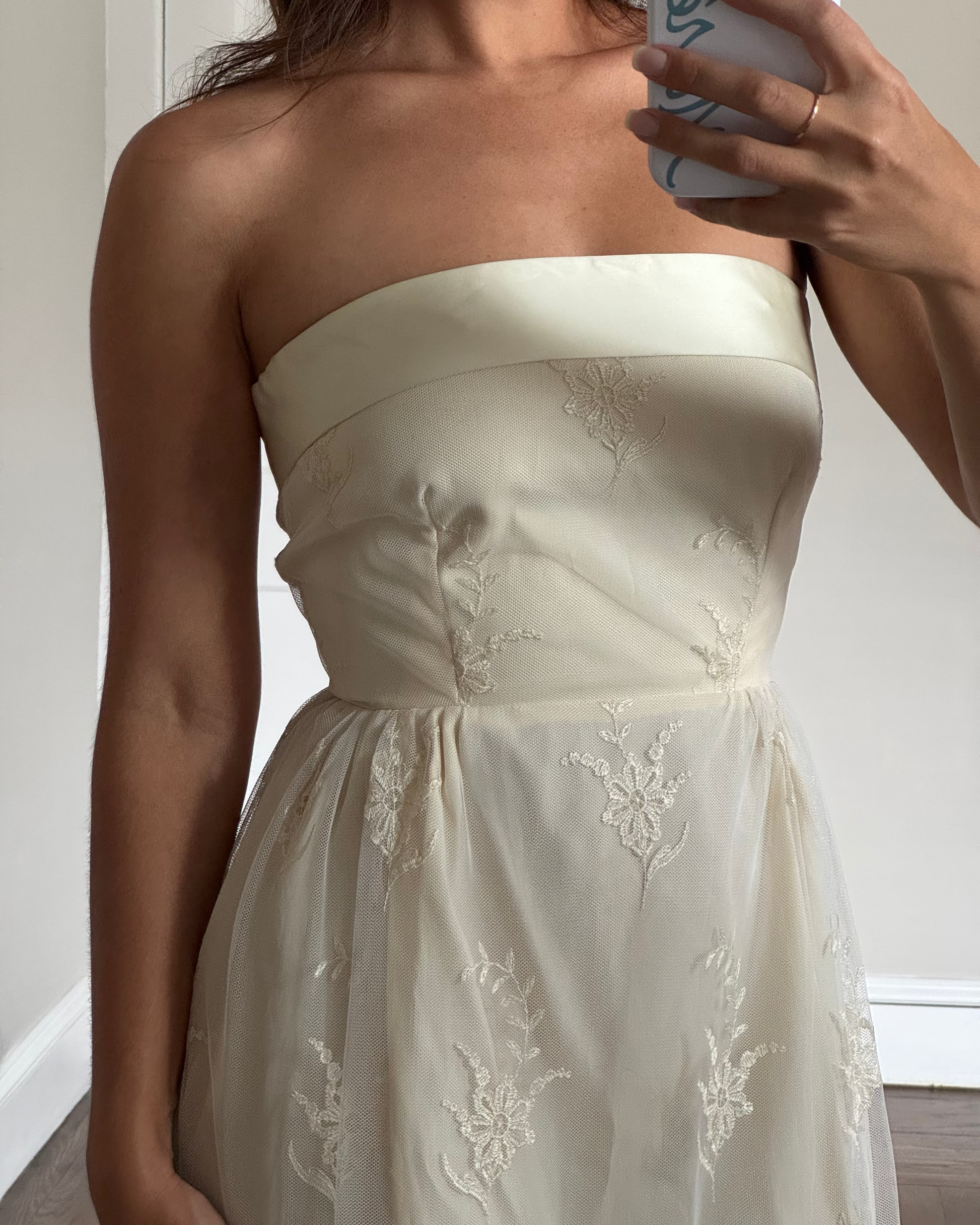 This vintage (likely 1950s–60s) ivory dress features a sculpted bodice, defined waist, full skirt, and back zipper closure — the kind of silhouette that never fades. Its construction and fabric texture suggest a mid-century origin, when every seam was placed with intention. The result is a piece that feels equally at home in a bridal capsule, engagement shoot, or rehearsal dinner moment.
