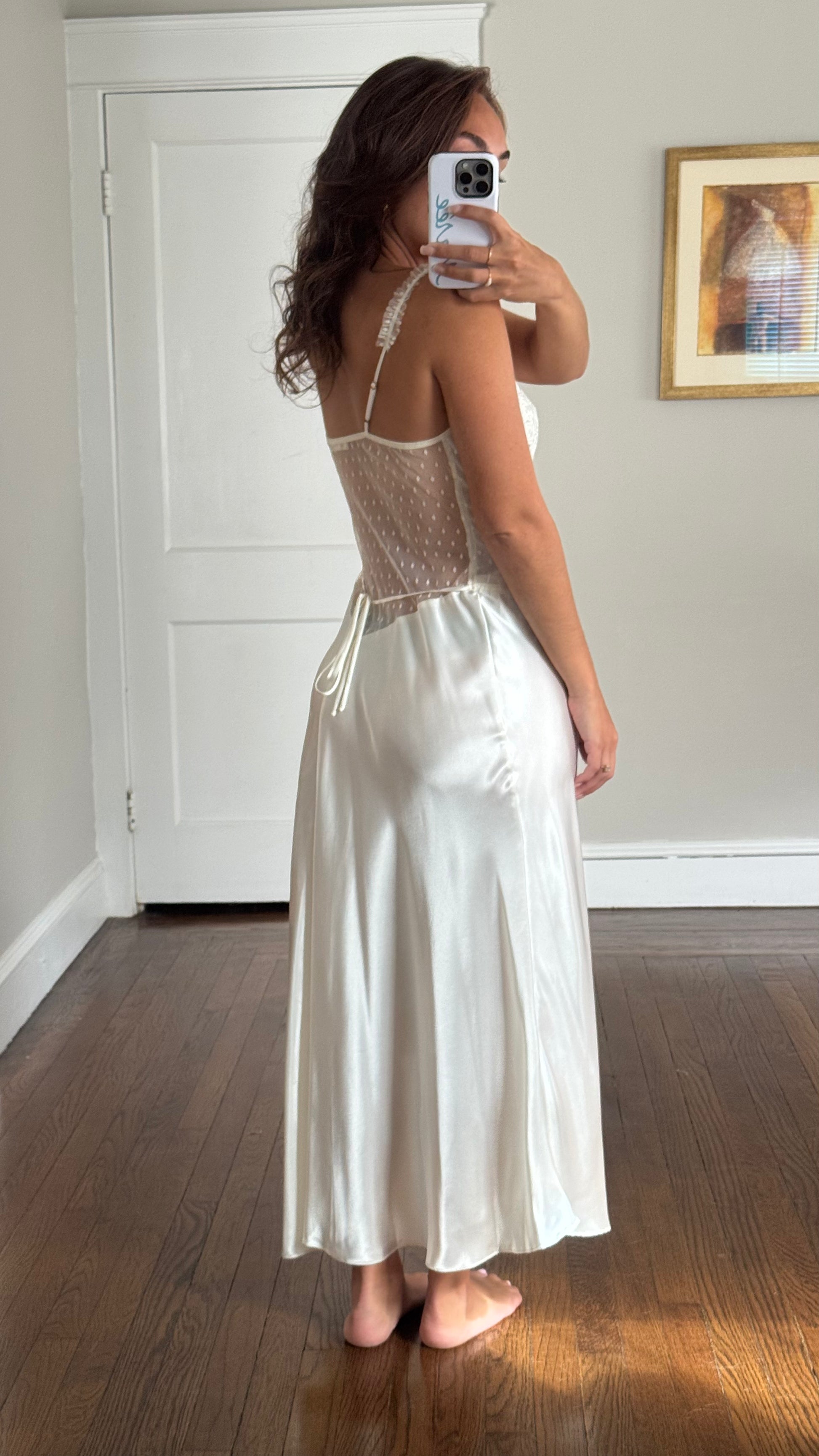 Romantic vintage slip by Flora featuring a dotted mesh body and delicate lace appliqué detailing. The airy, sheer fabric and soft feminine design make this piece perfect as a bridal getting-ready look, honeymoon nightgown, or collectible vintage lingerie.