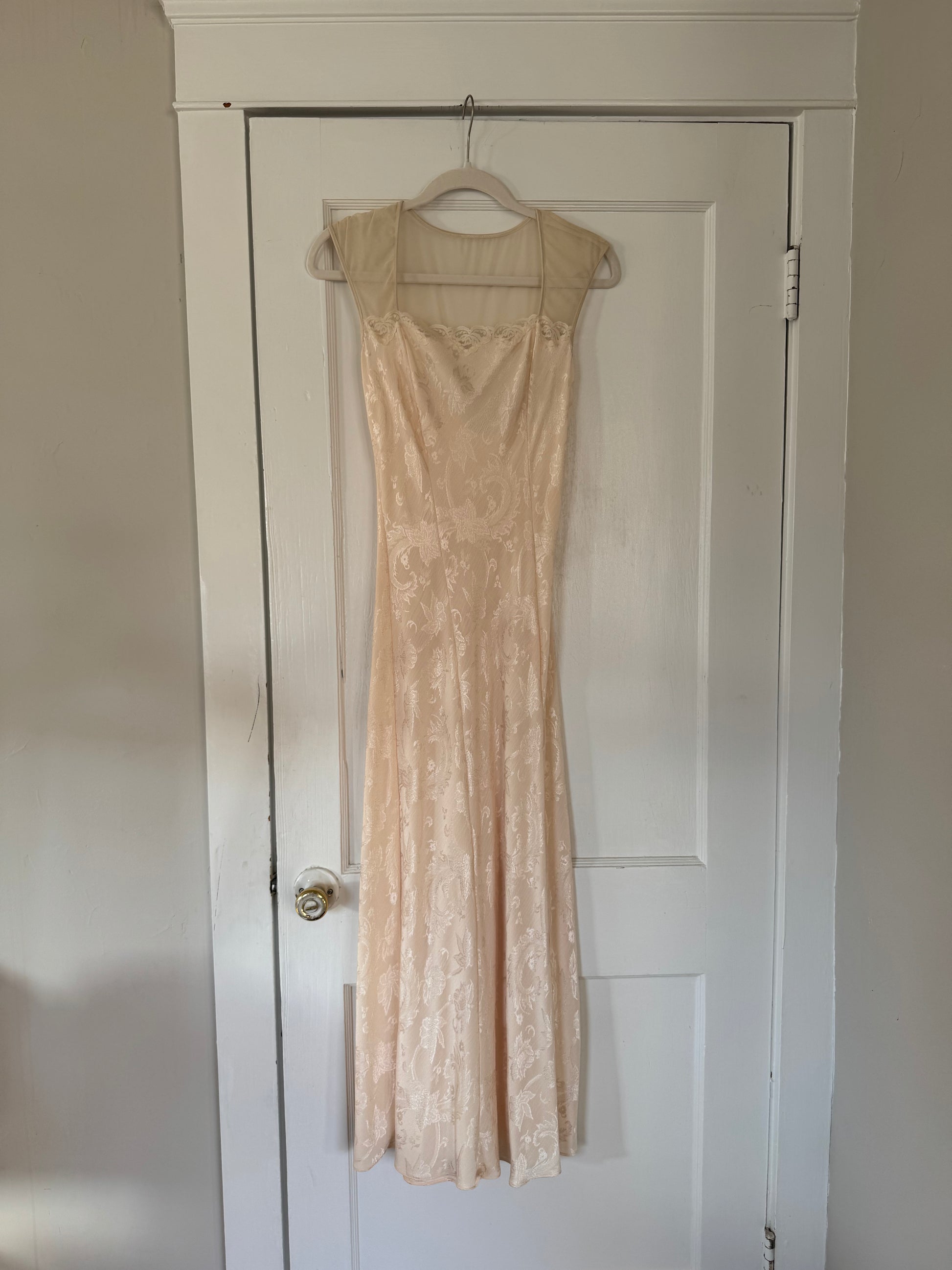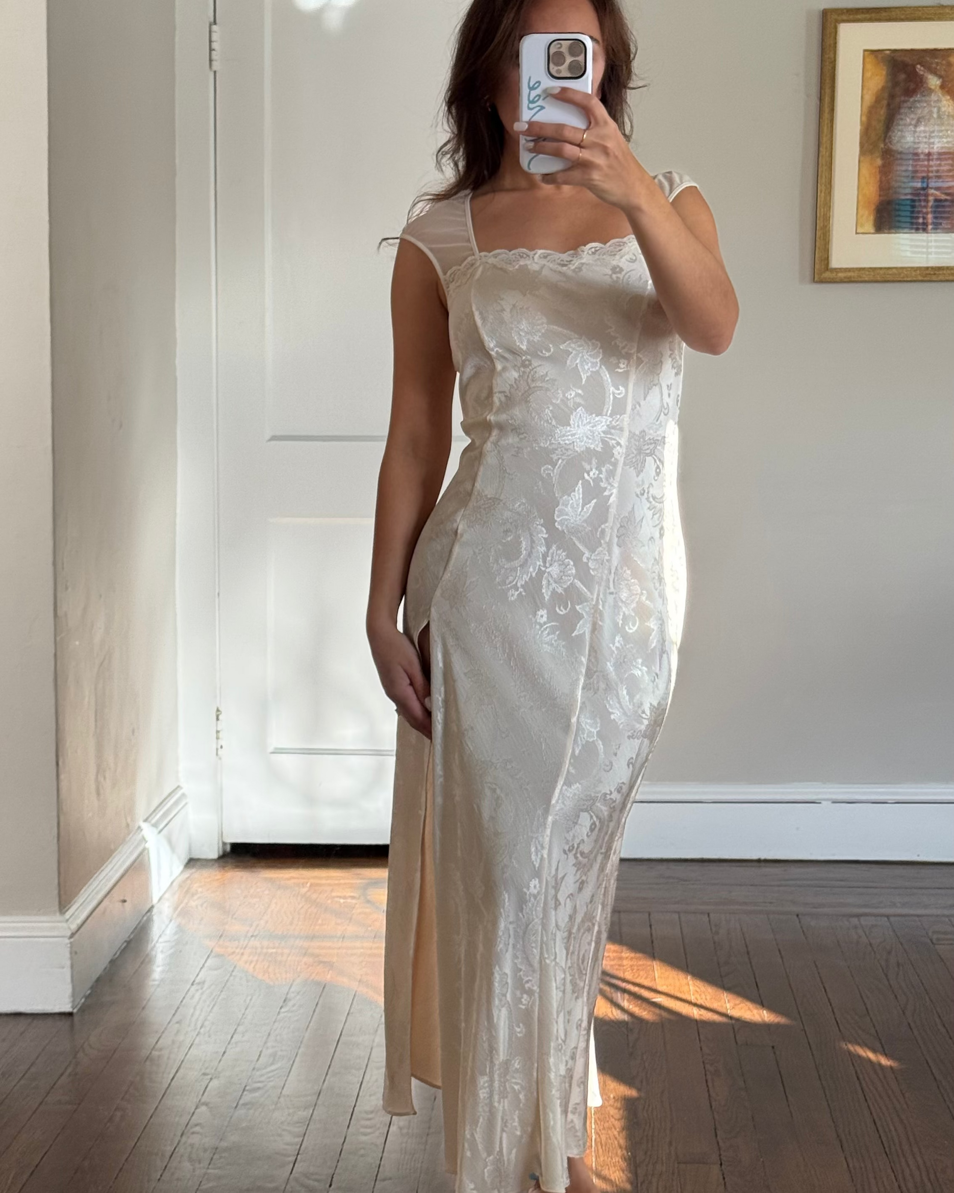 A beautiful 90s Victoria's Secret slip dress with cap sleeves, crafted in an elegant ivory jacquard with a soft sheen that catches the light beautifully. This piece blends dreamy bridal romance with iconic 90s VS femininity — delicate, luxe, and effortlessly flattering.